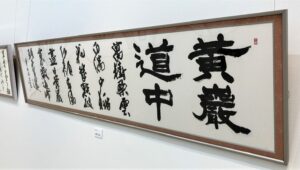書作品の展示。濃墨または、淡墨を使い刀で紙を切るような鋭い線と柔らかい曲線とが組み合わさる淡翠会独自の書法をお楽しみください。