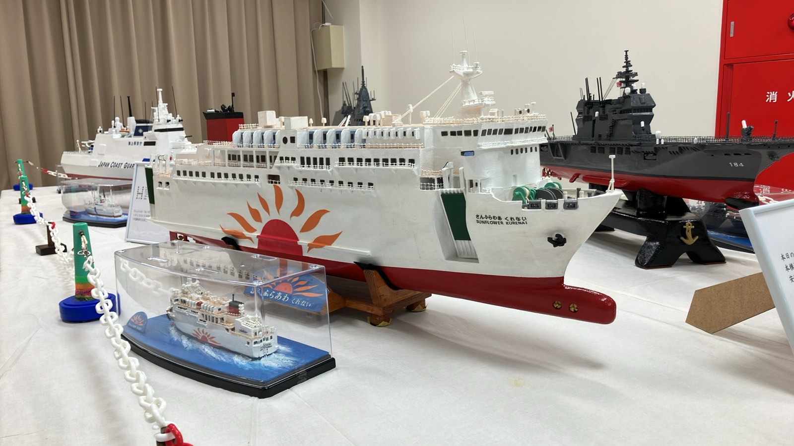 高齢者が廃材を利用し手作りで、船の美しさを絶妙優雅に創り出した船舶模型の展示です。